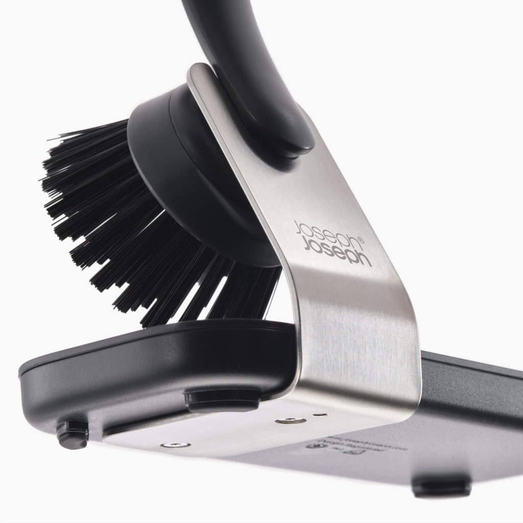 Zamaščen pekač za meso po lasagnjah se zdi nepremagljiv. Trde ščetine krtače se brez obotavljanja lotijo dela, gobica pa dodela podrobnosti. In ko je končano, se vse vrne v stojalo, kjer ne samo da izgleda dobro, ampak se tudi hitro suši. Kaj bi si želeli več?