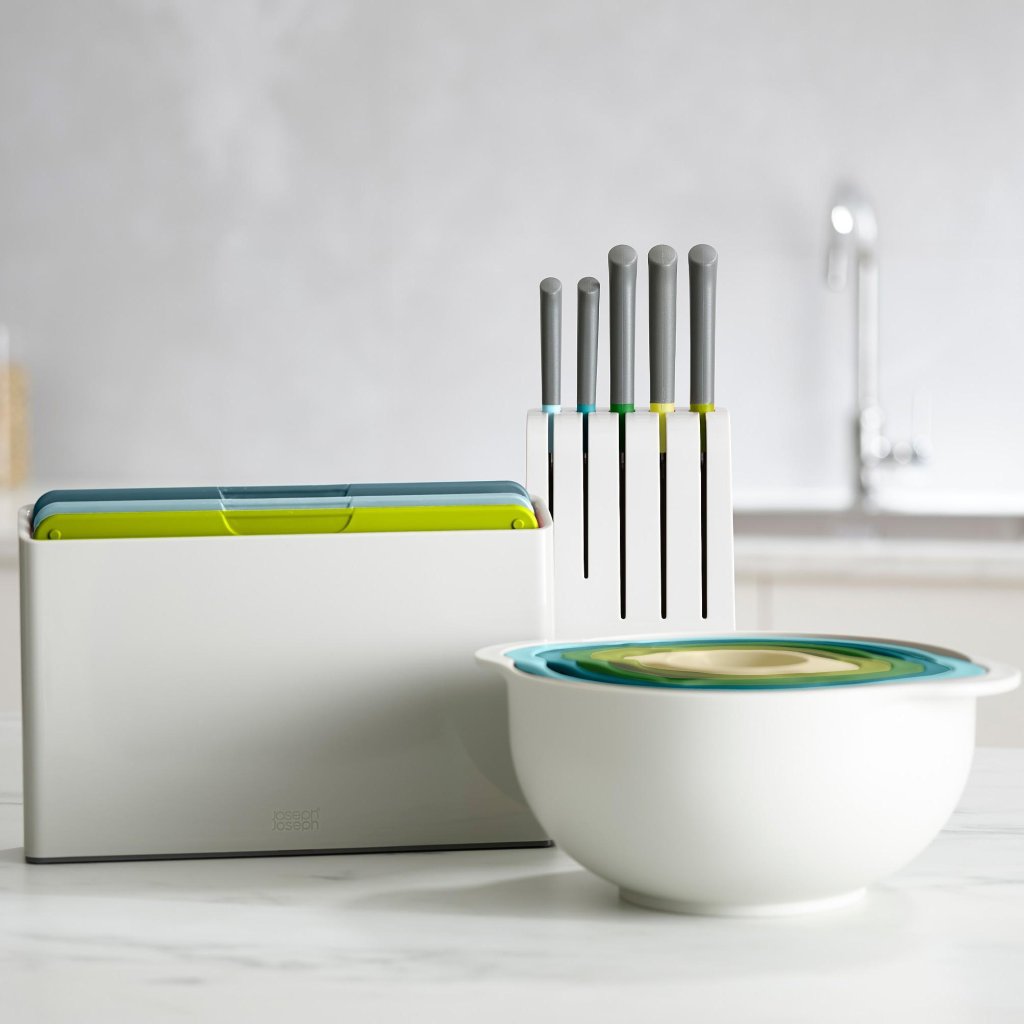 - Stojalo za nože Joseph Joseph DUO predstavlja popolno rešitev za vsakodnevno pripravo živil, ki združuje kakovostna rezila in pregledno shranjevanje na enem mestu.