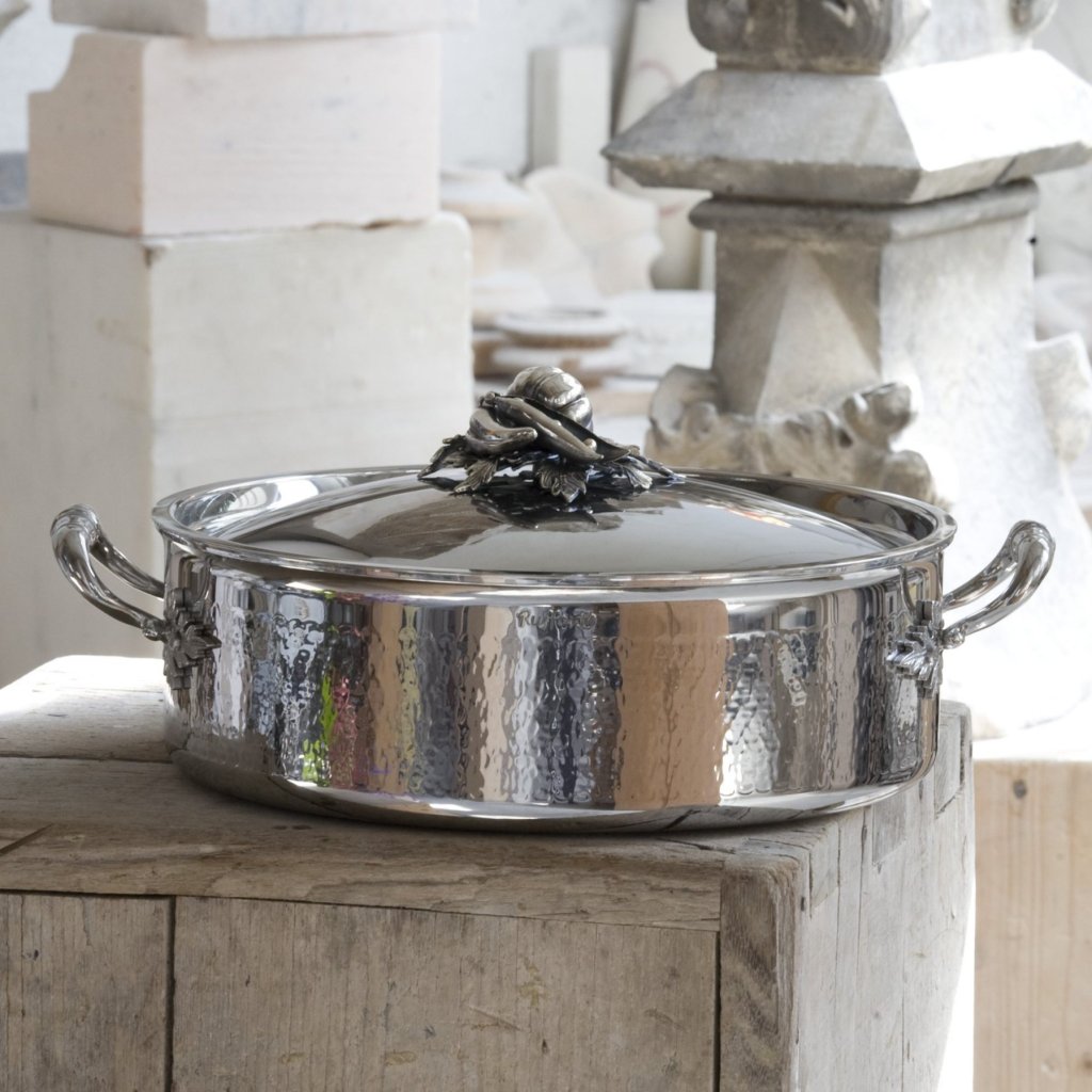 - ročaji iz nerjavečega jekla in ročaj pokrova so okrašeni z drobnimi listi in pritrjeni s trpežnimi zakovicami iz nerjavečega jekla