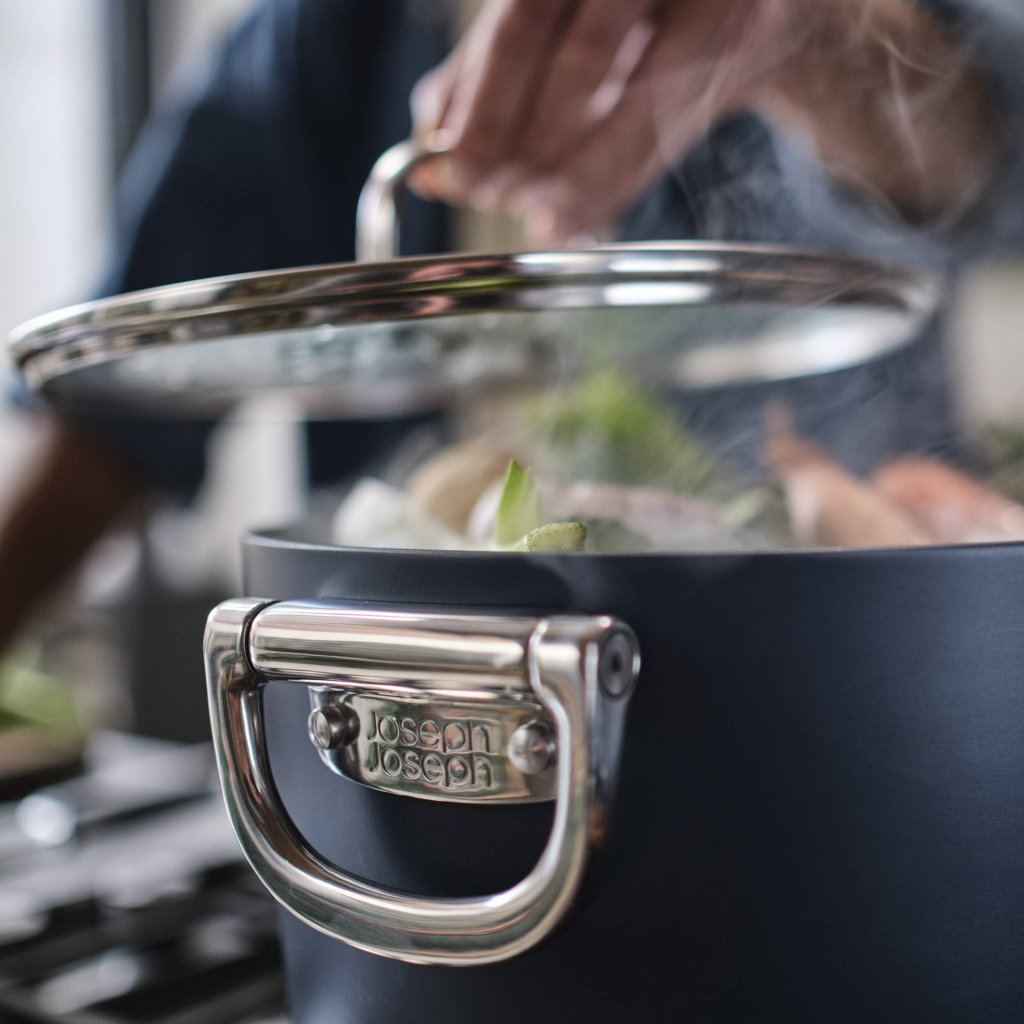 Kuhinjska posoda, ki razume realnost sodobne kuhinje - Joseph Joseph SPACE. Med kuhanjem stoji trdno in varno, pripravljeno na vse, od hitrega zajtrka do improvizirane večerje. Ko pa pride čas za pospravljanje, spremeni svoj značaj in se neopazno prilagodi prostoru, ne da bi zahtevala več prostora, kot je nujno potrebno. Kaj več bi si lahko želeli?