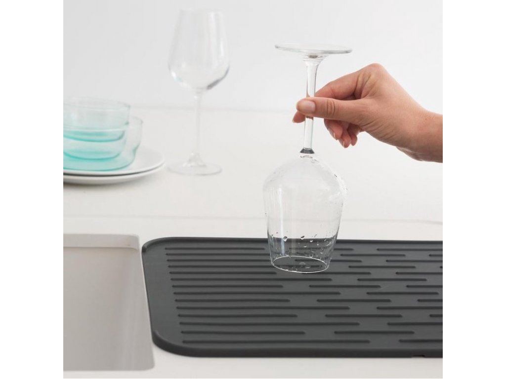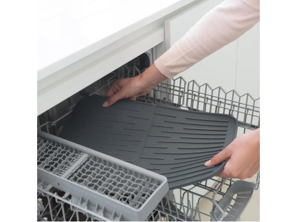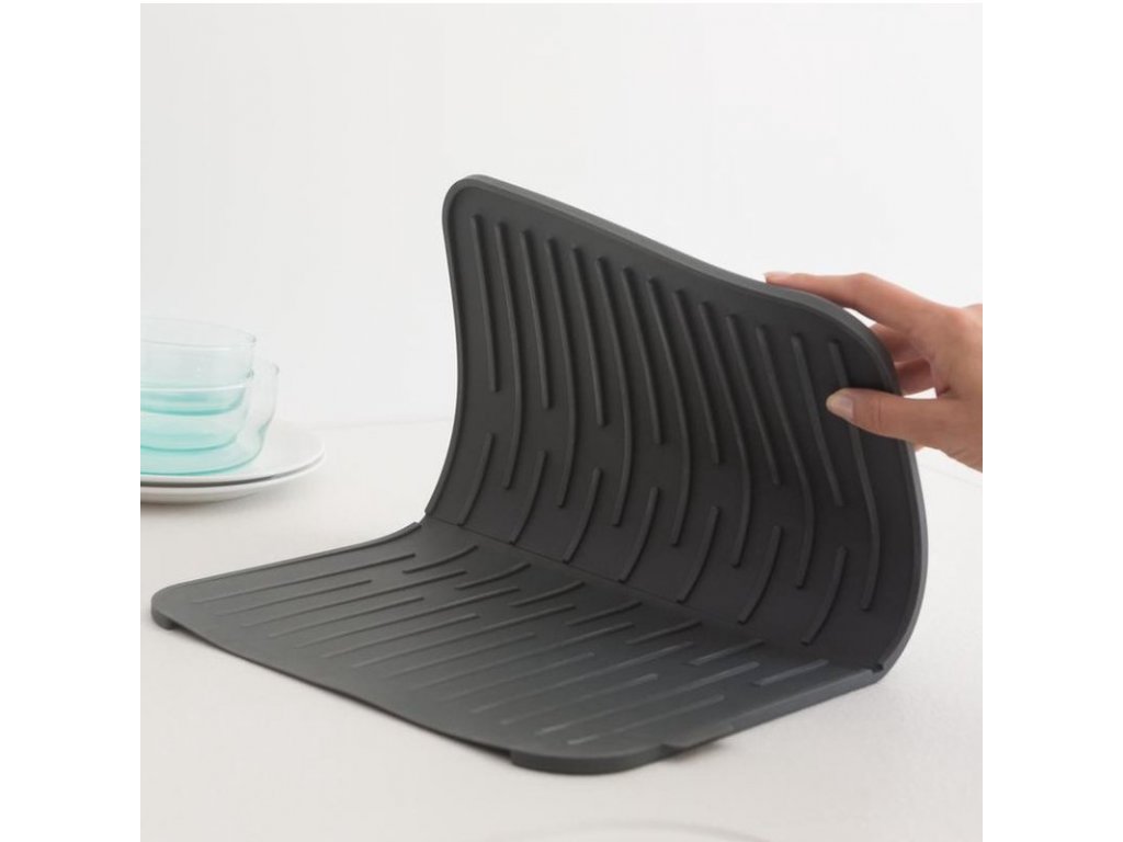 Silikonski odcejalnik za posodo z nedrsečo površino, primeren za krožnike, skodelice in krhko steklo. Voda iz kapljajoče posode odteka neposredno v pomivalno korito, zato delovna površina ostane suha. Enostavno vzdrževanje, varno za pomivanje v pomivalnem stroju.