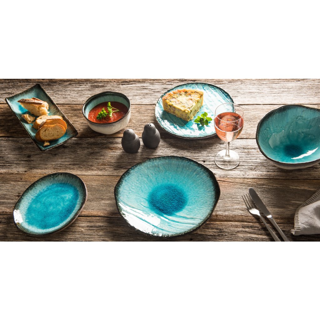 Jedi iz kolekcije Sky Blue vas bodo popeljale na morje. Njegova globoka turkizna barva spominja na čisto morje, rjav rob pa na obalo. Posode iz te zbirke imajo sijajno površino z razpokano glazuro. Neenakomeren rob kaže na ročno delo.