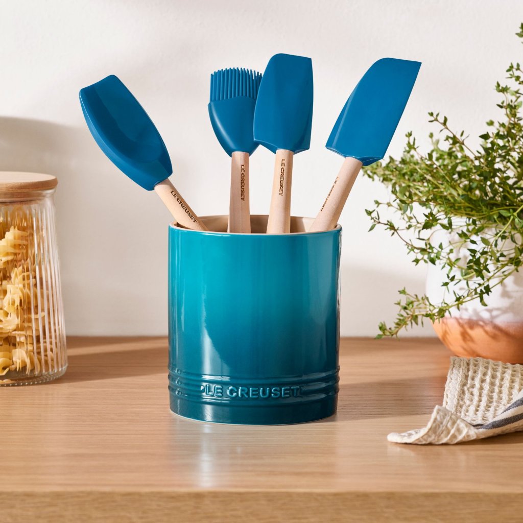 - Keramično stojalo za kuhinjski pripomočki Le Creuset v odtenku DEEP TEAL bo vaše lesene žlice, lopatice, metlice in druge pripomočke lepo in elegantno shranilo pri roki.