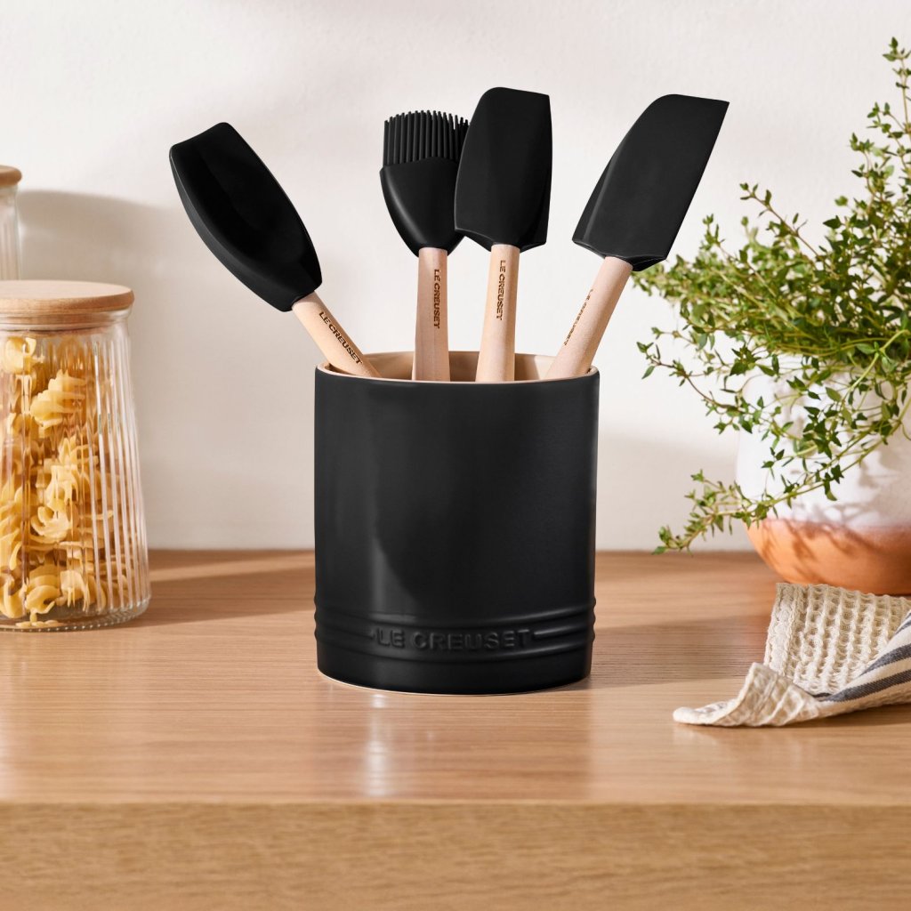 - Keramično stojalo za kuhinjski pripomočki Le Creuset v odtenku SATIN BLACK bo vaše lesene žlice, lopatice, metlice in druge pripomočke lepo in elegantno shranilo pri roki.