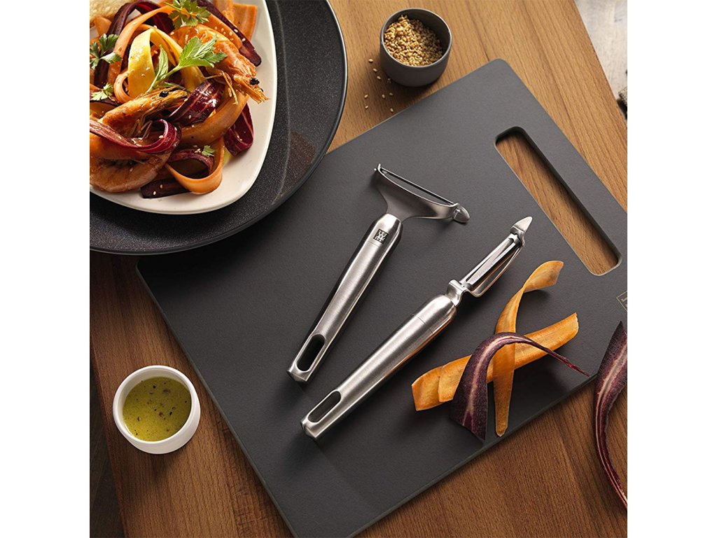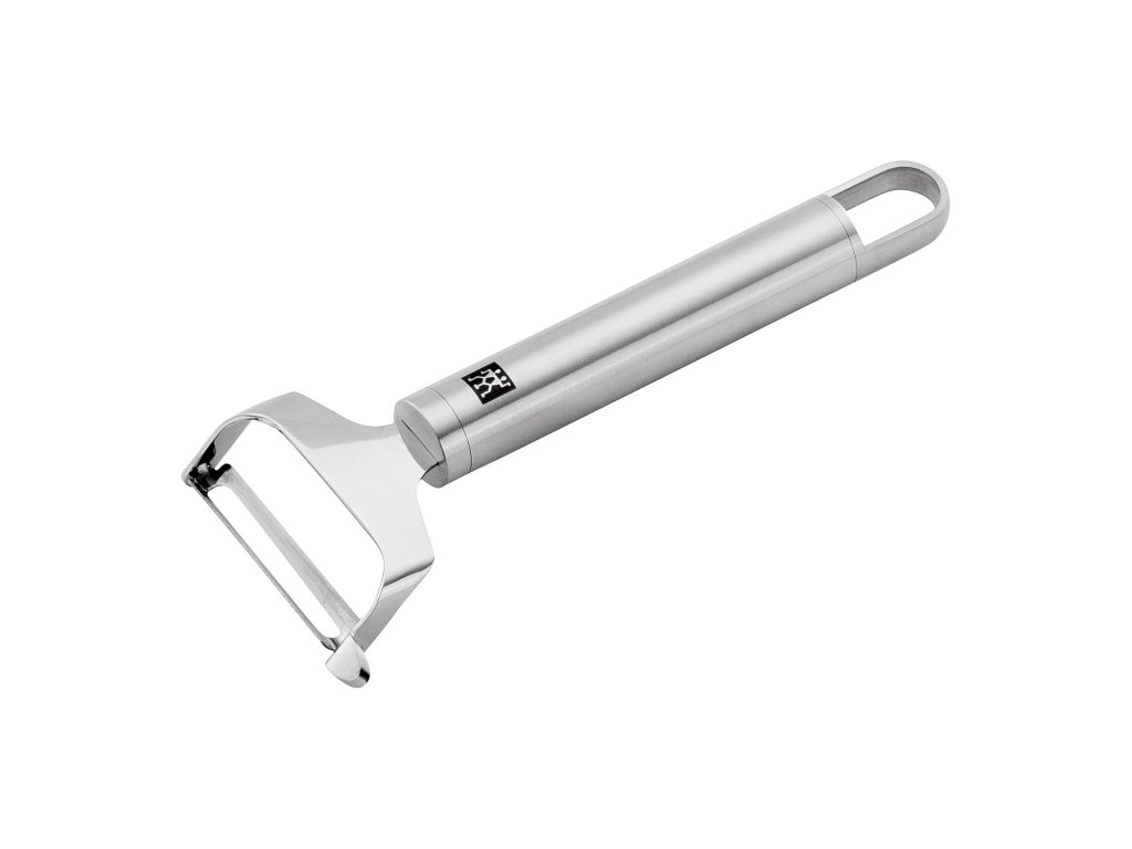 Praktičen lupilec zelenjave s križnim rezilom iz nerjavnega jekla s premičnim rezilom in zanko za obešanje. Primeren je za desničarje in levičarje.