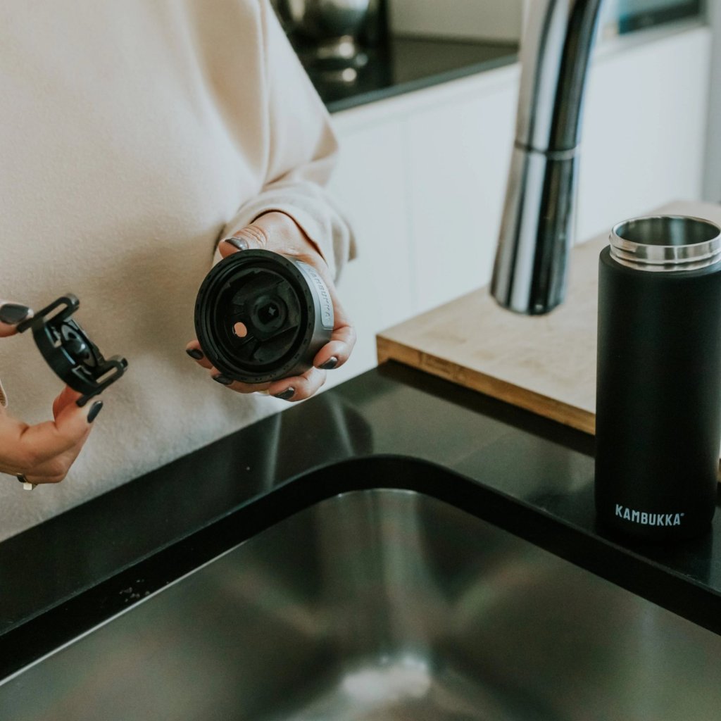 - Darilni paket Kambukka vsebuje dizajnersko termo lonček ETNA s prostornino 500 ml in dvema pokrovčkoma - 3-v-1 pokrovčkom ETNA in navojnim pokrovčkom RENO v črni barvi
