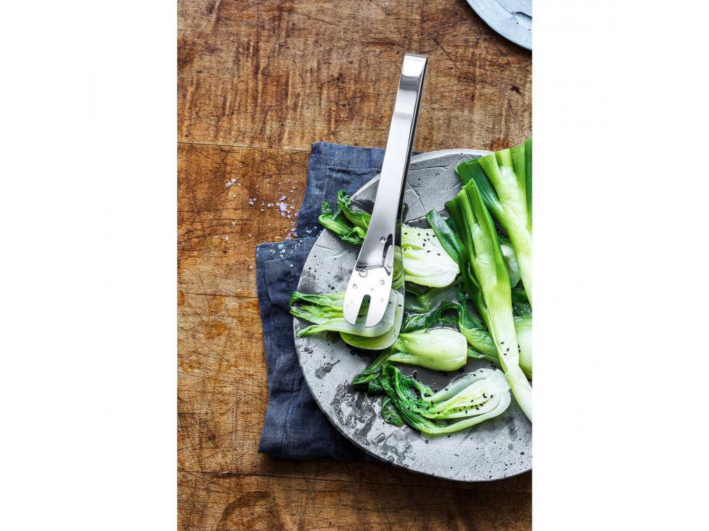 Univerzalne kuhinjske klešče Nuova so izdelane iz poliranega nerjavečega jekla Cromargan®. Ta večnamenski pripomoček se uporablja za serviranje čipsa, testenin, špargljev, solate, rib, zelenjave ali celo kot klešče za peko ali žar. Enostavno čiščenje. Primerno za pomivanje v pomivalnem stroju.