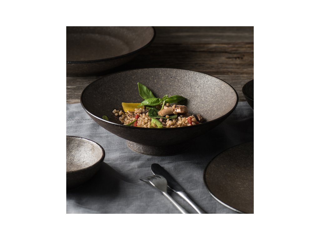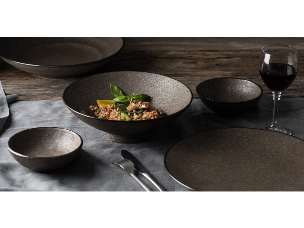 Za kolekcijo Earth Black so značilne zemeljske barve, zrnata površina in rob s temno sijajno glazuro. Posoda iz te zbirke je videti, kot da je narejena iz kamna, in bo vašemu obedovanju dodala pridih starodavnega razkošja.