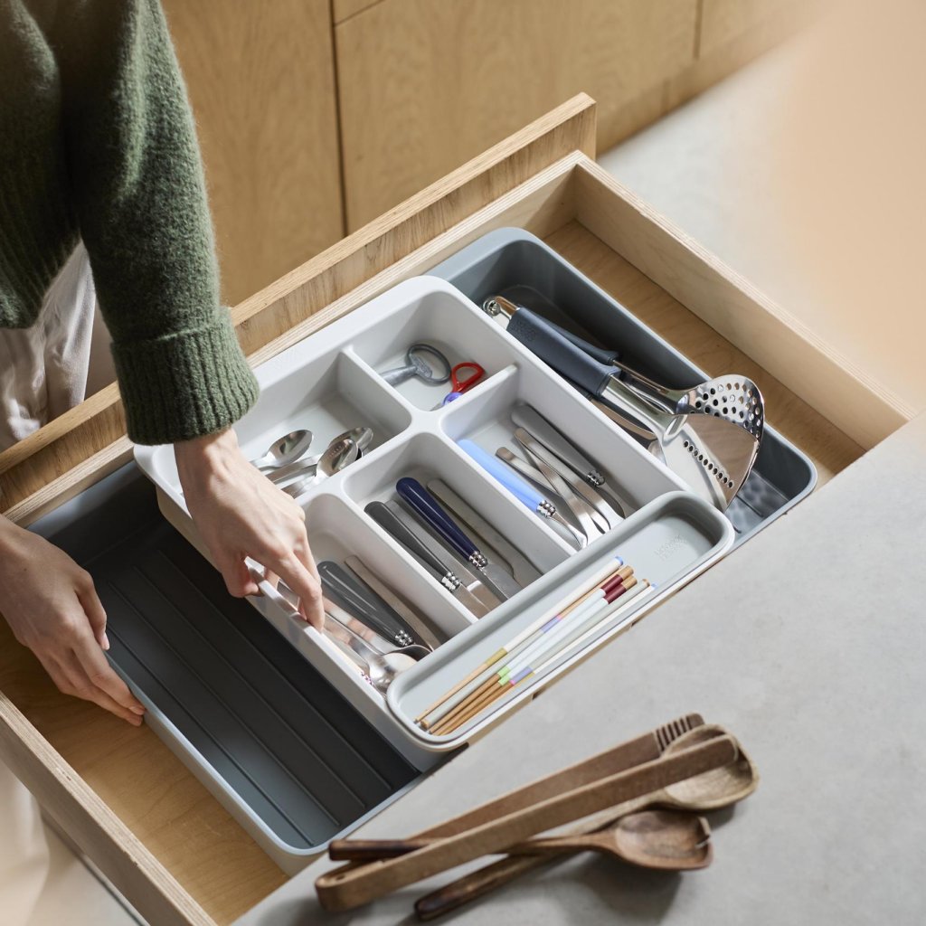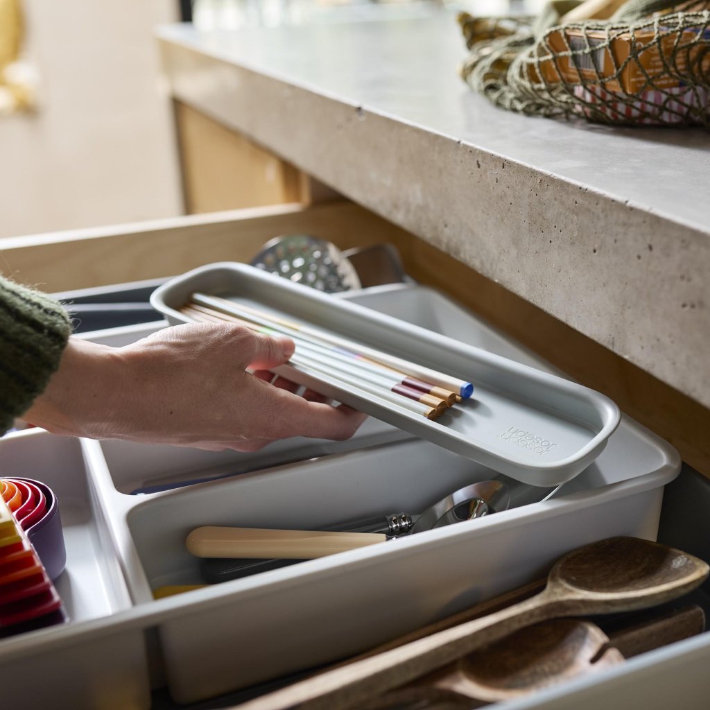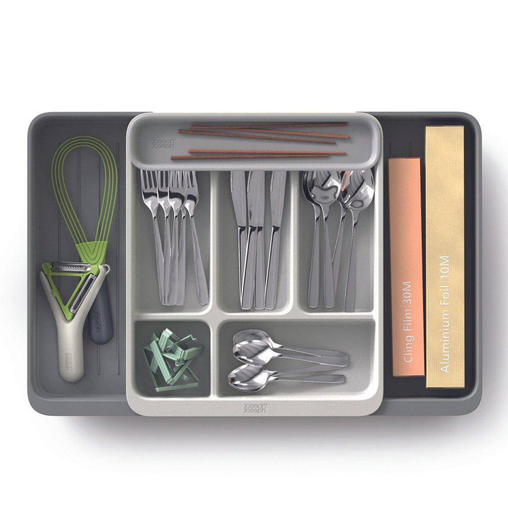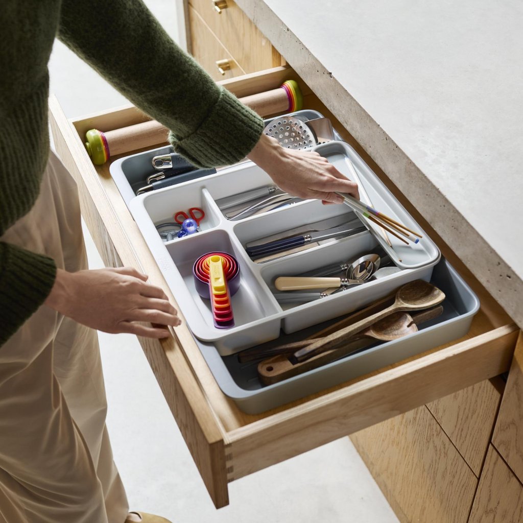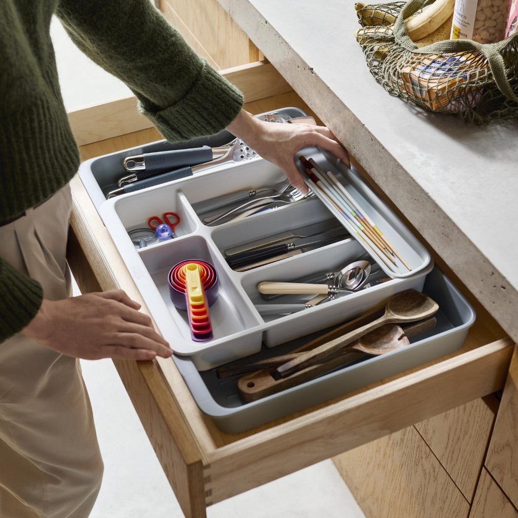 - Organizator predala Joseph Joseph DRAWERSTORE pomaga pregledno organizirati jedilni pribor, kuhinjski pripomočki in manjše orodje v kuhinjskem predalu.