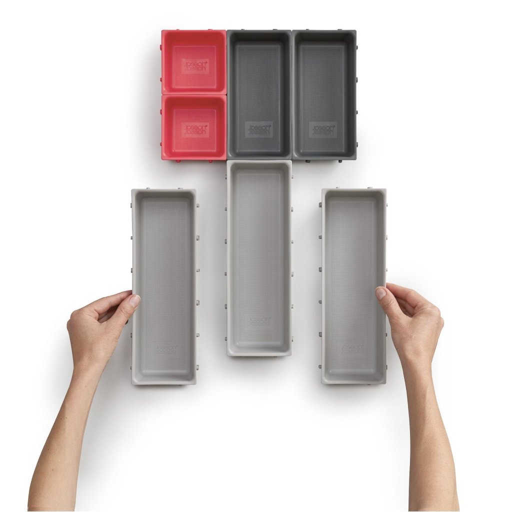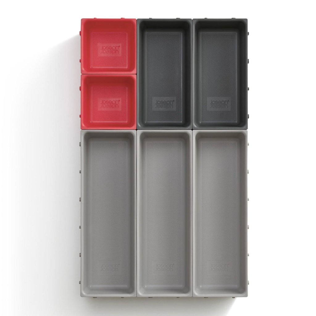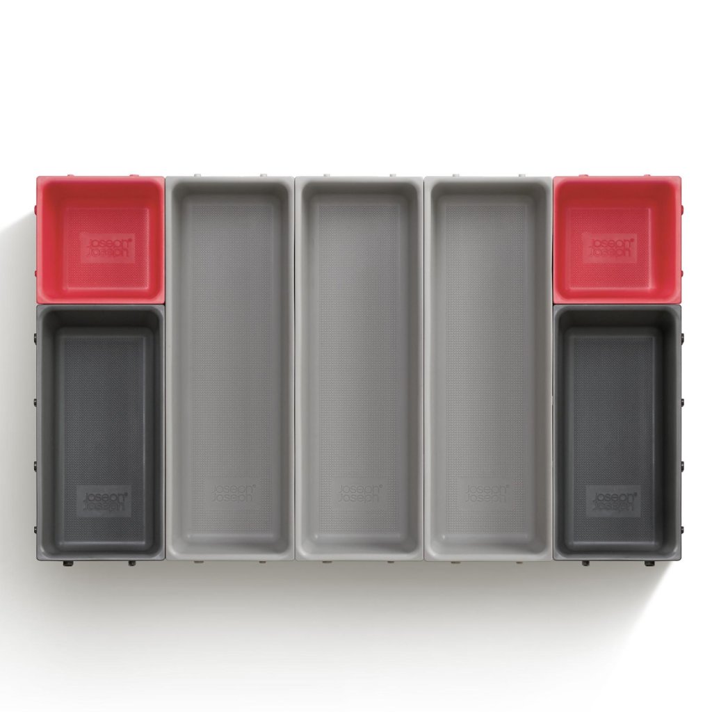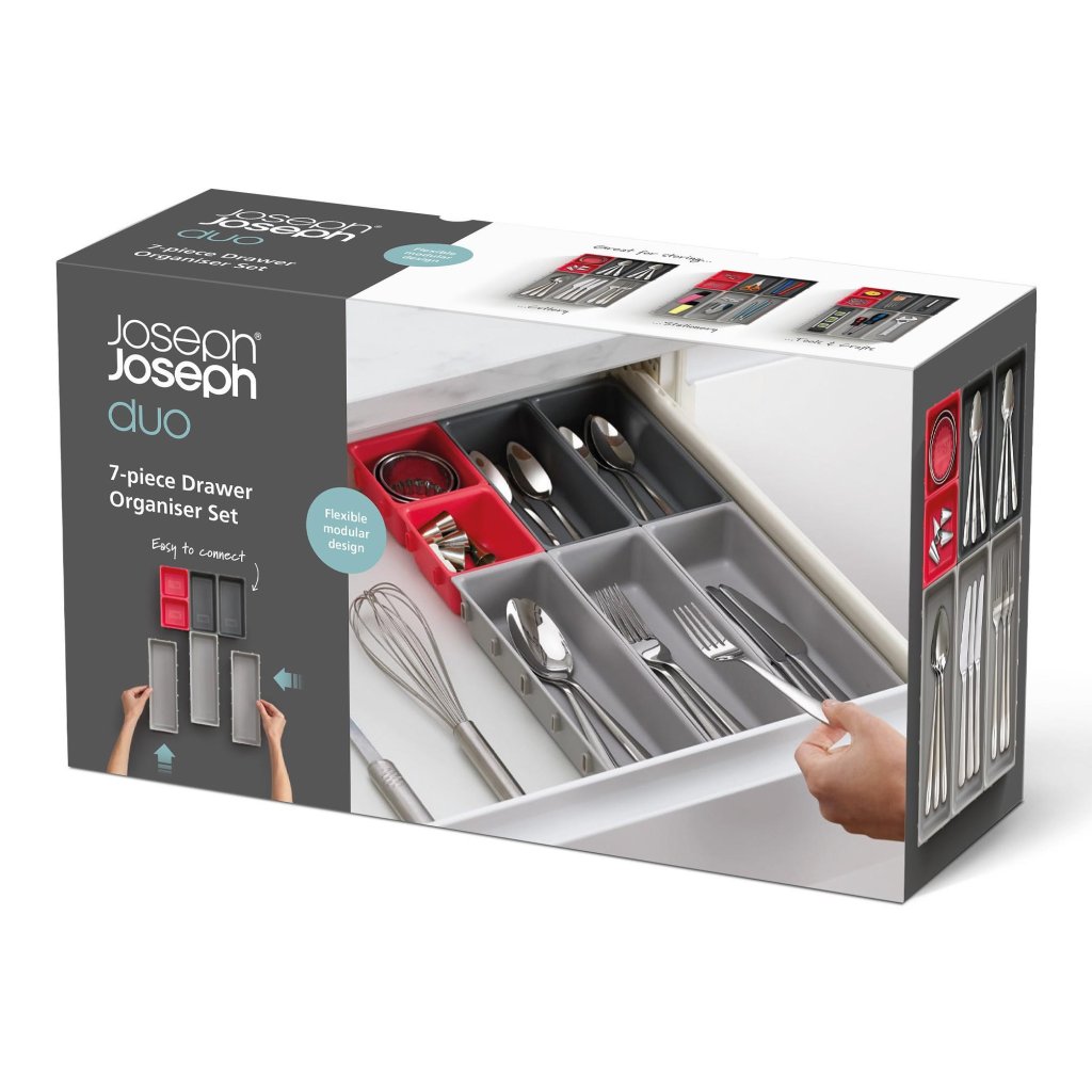 - Vsestranski organizator za predal Joseph Joseph DUO BLOX predstavlja prilagodljivo rešitev za popolno ureditev prostora v kuhinji, pisarni in delavnici.
