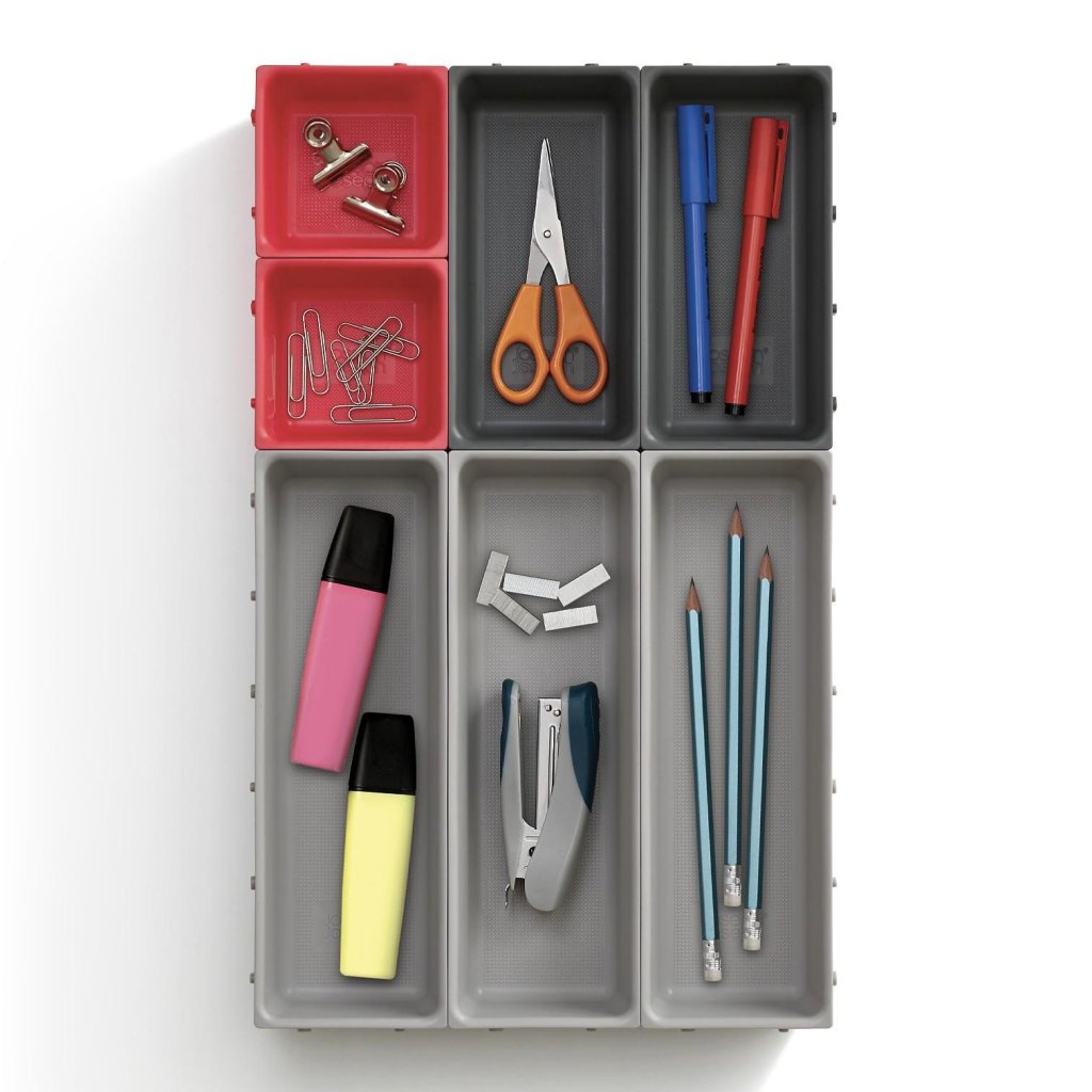 - Komplet vsebuje 7 samostojnih plastičnih posodic različnih velikosti, ki jih lahko poljubno kombinirate glede na velikost in obliko vašega predala.