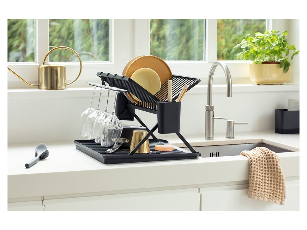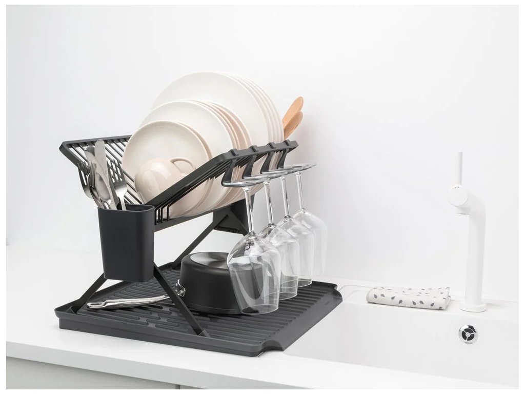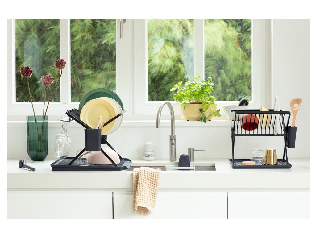 Zložljivo stojalo za sušenje posode Brabantia SinkSide s pladnjem za kapljanje odlično drži krožnike, lonce, ponve in kozarce. Vanj lahko pospravite do 17 krožnikov ali loncev, ponev in kozarcev, vključno z občutljivimi kozarci za vino. Posode za sušenje jedilnega pribora in posode so odstranljive, zato jih je enostavno zložiti in shraniti. Resnično pametno stojalo, ki je dovolj lepo, da ima stalno mesto v vaši kuhinji.