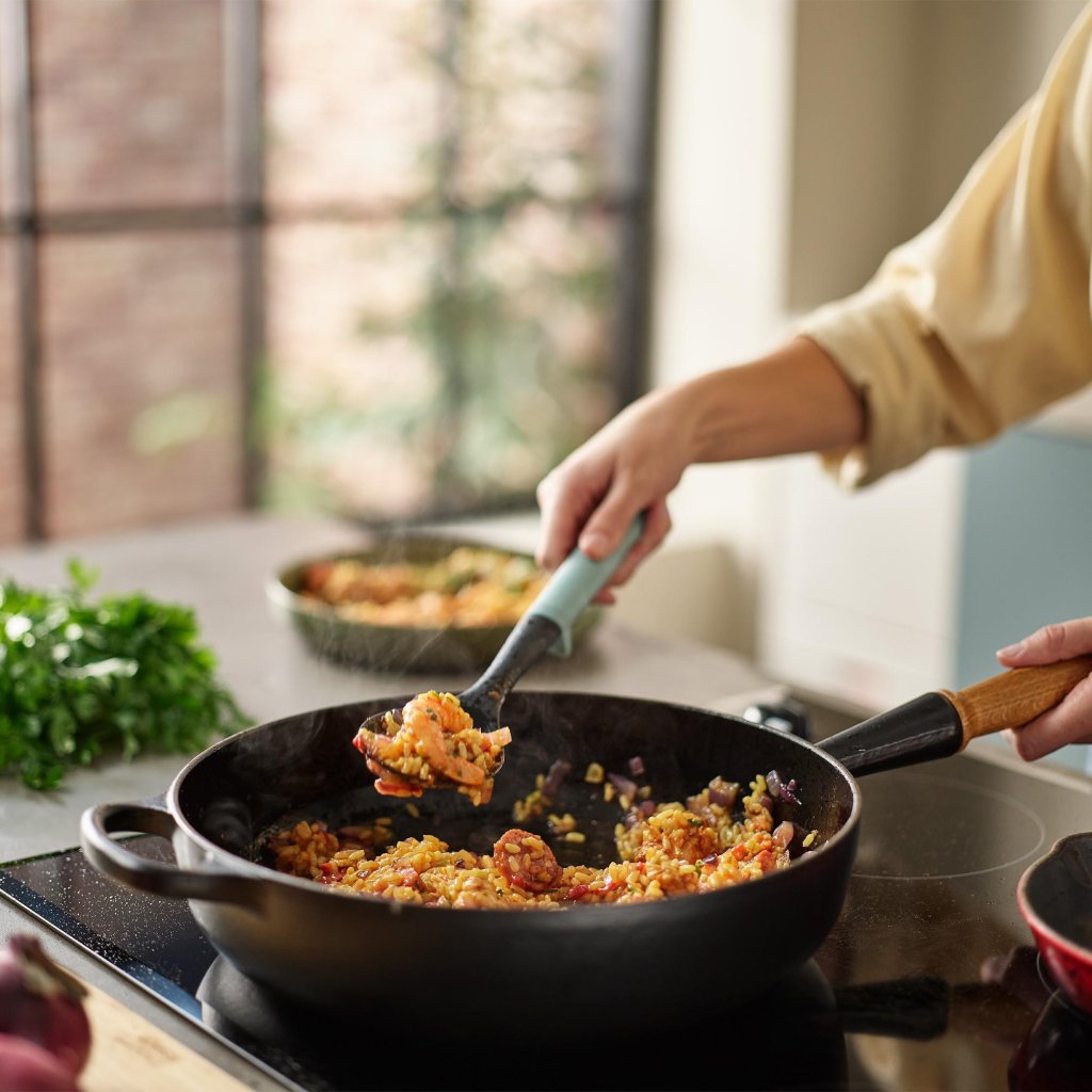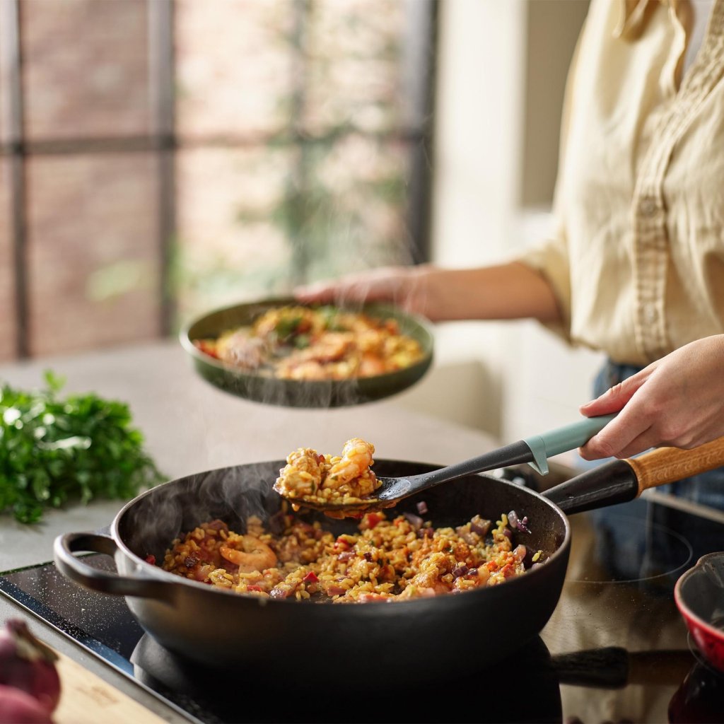 - Lahka konstrukcija olajša rokovanje pri zajemanju, obračanju in postrežbi jedi neposredno iz ponve na krožnik.